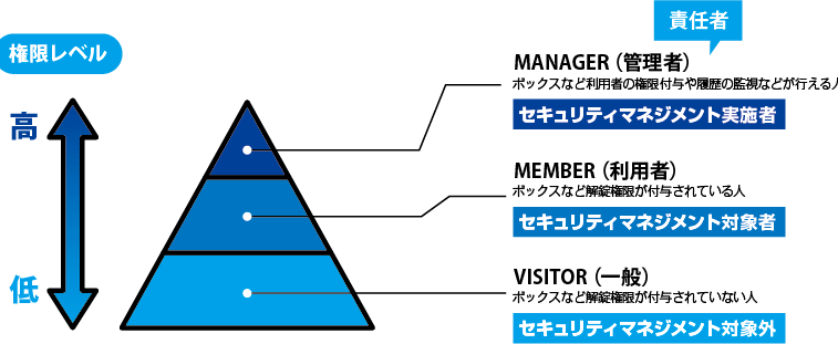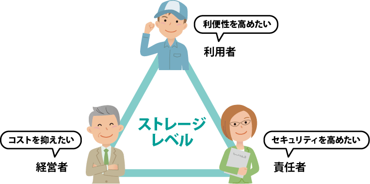 利便性を求める利用者にとって、セキュリティが高くなることはあまり受け入れられることでありません。そこで、セキュリティのレベルをマネジメントするストレージレベルの定義付けが、セキュリティと利便性・コストのバランスを考える上でとても重要になります。