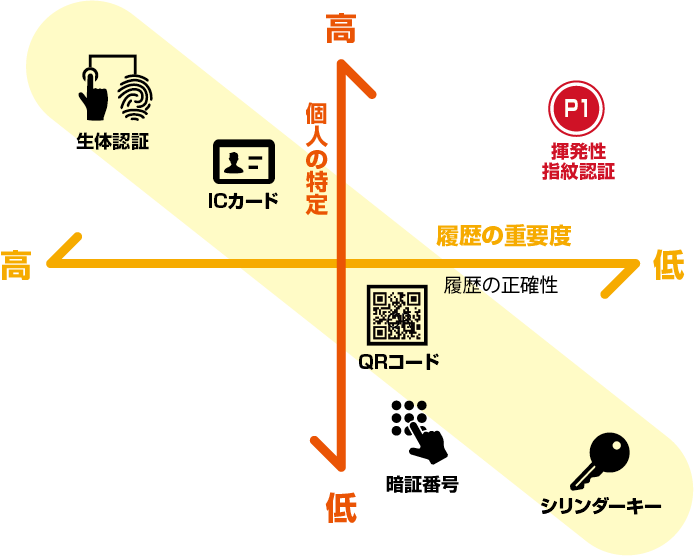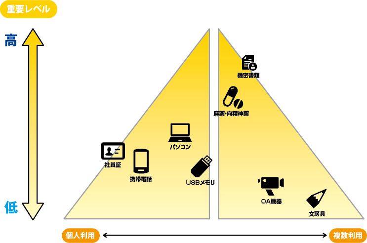 モノの重要度や使う頻度によって必要なセキュリティは変わります。例えば、機密文章や個人情報、PC・スマホ・お金など、守りたいモノがとても重要(価値の高いモノ)であれば、セキュリティ度は高めなければなりませんし、逆にそんなに重要でなければ利便性を損ない、コストもかかります。また、多くの人が何度も使うモノであれば、履歴は必要かも知れませんが、特定の人のみが使うモノであれば履歴は不要かも知れません。