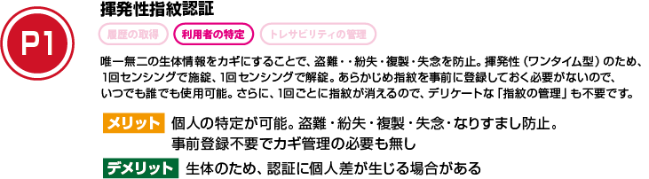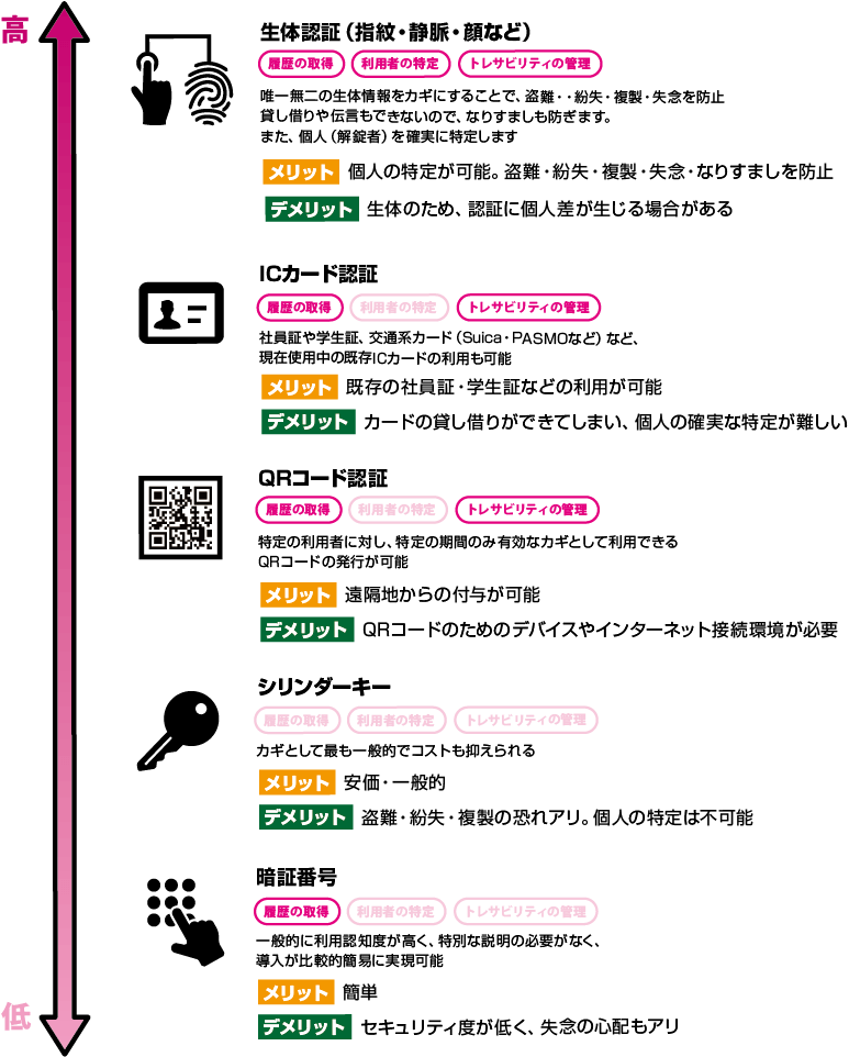 カギの貸し借りができる、どのカギが使われたか(どのカギで解錠されたか)が把握できる、カギの使用者(だれが解錠したか)が特定できるなど、認証レベルによって、さまざまなセキュリティマネジメントが可能です。
